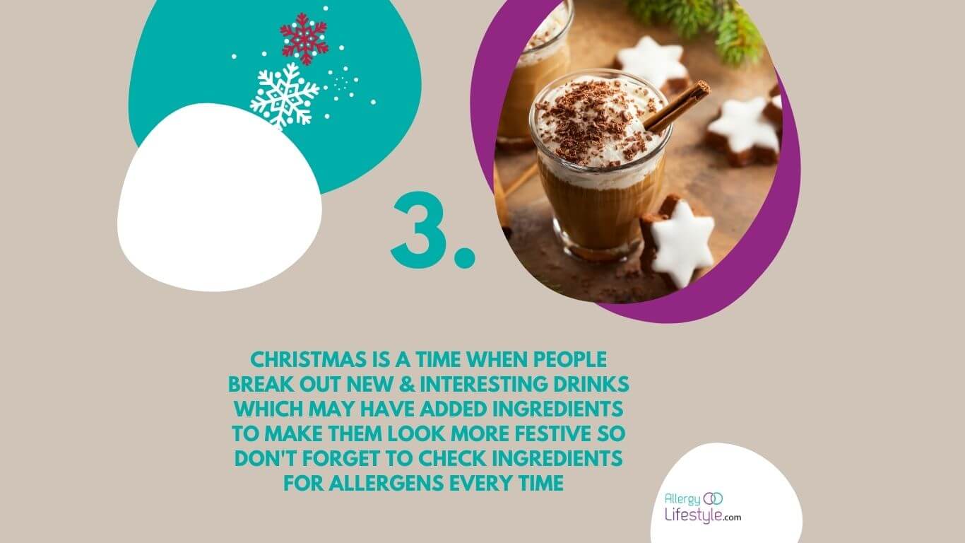 Christmas is a time when people break out new & interesting drinks which may have added ingredients to make them look more festive so don’t forget to check Ingredients for allergens every time.