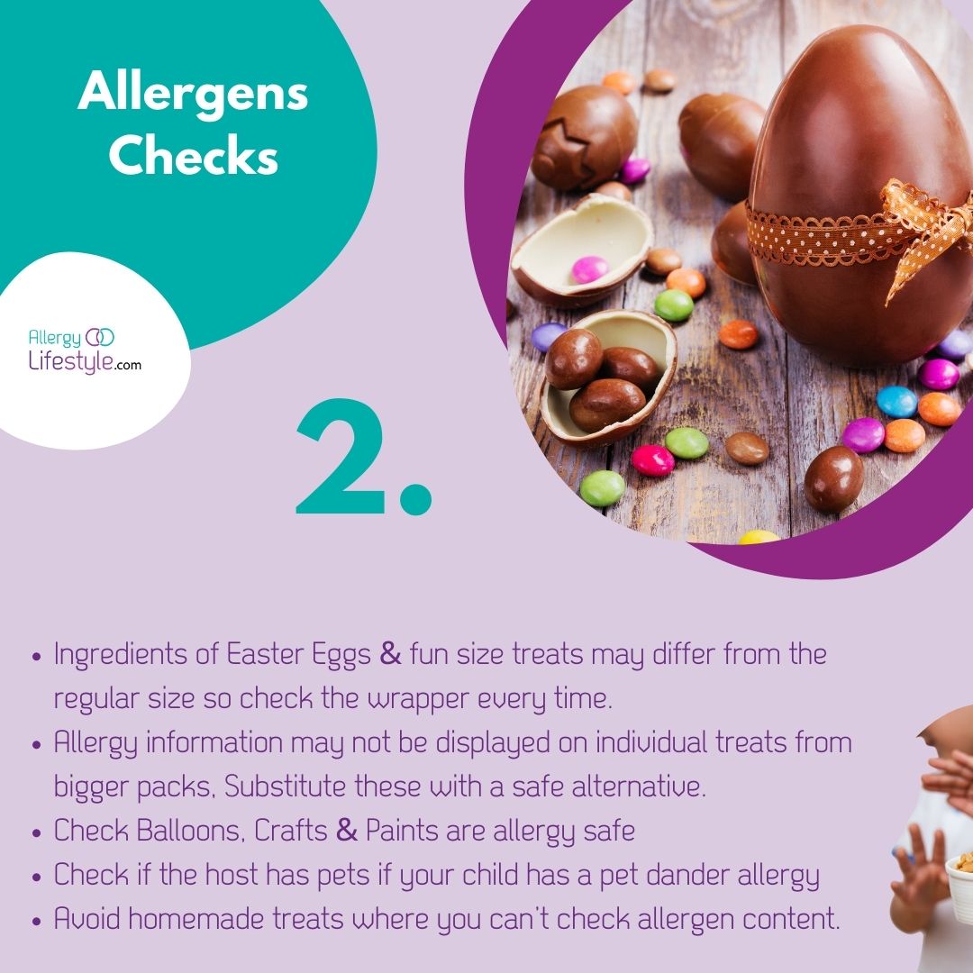 - Ingredients of Easter eggs/treats may differ, so check the wrapper each time. Allergy info may not be displayed on individual treats from bigger packs. Substitute these with a safe alternative. Check balloons, crafts & paints are allergy safe. Check if the host has pets if your child has a pet dander allergy. Avoid homemade treats where you can’t check the allergy content.