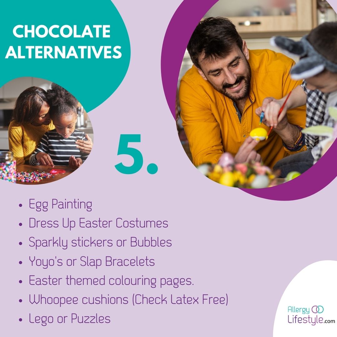 - Host an Easter egg hunt with: chocolate eggs you know are allergen free, plastic eggs filled with trinkets/coins.